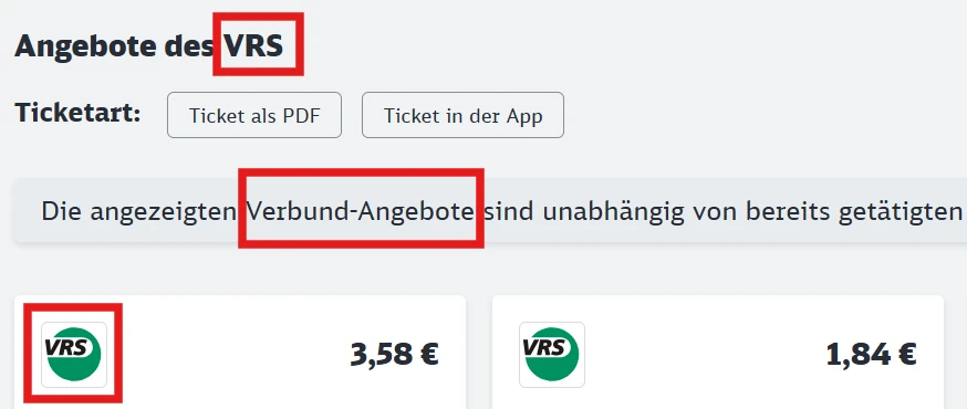 Als grobe Orientierung kann auch im DB Navigator oder der Website der DB geprüft werden, ob für eine Strecke Verbundtickets verkauft werden. Diese sind als Verbund-Angebote, mit dem Logo und unter Angebote des [Verkehsverbundnamen] gekennzeichnet.