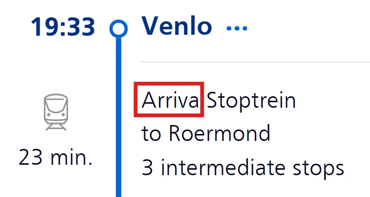 You can search for journeys and trains using the connection search. For each train in a connection, the operator is indicated. For connections with transfers, you need to expand the full connection. The operator (Carrier) is also shown in the connection details.
