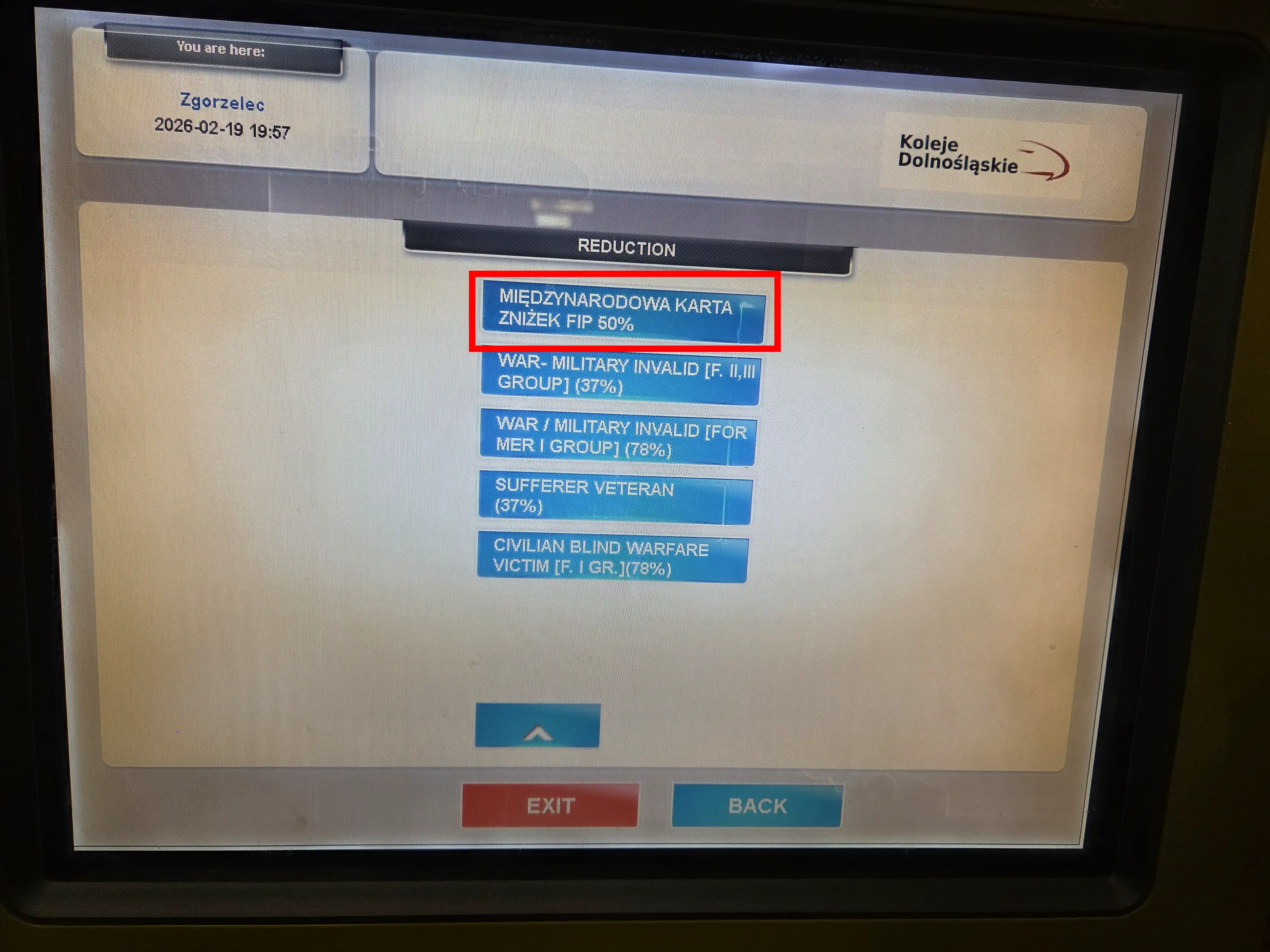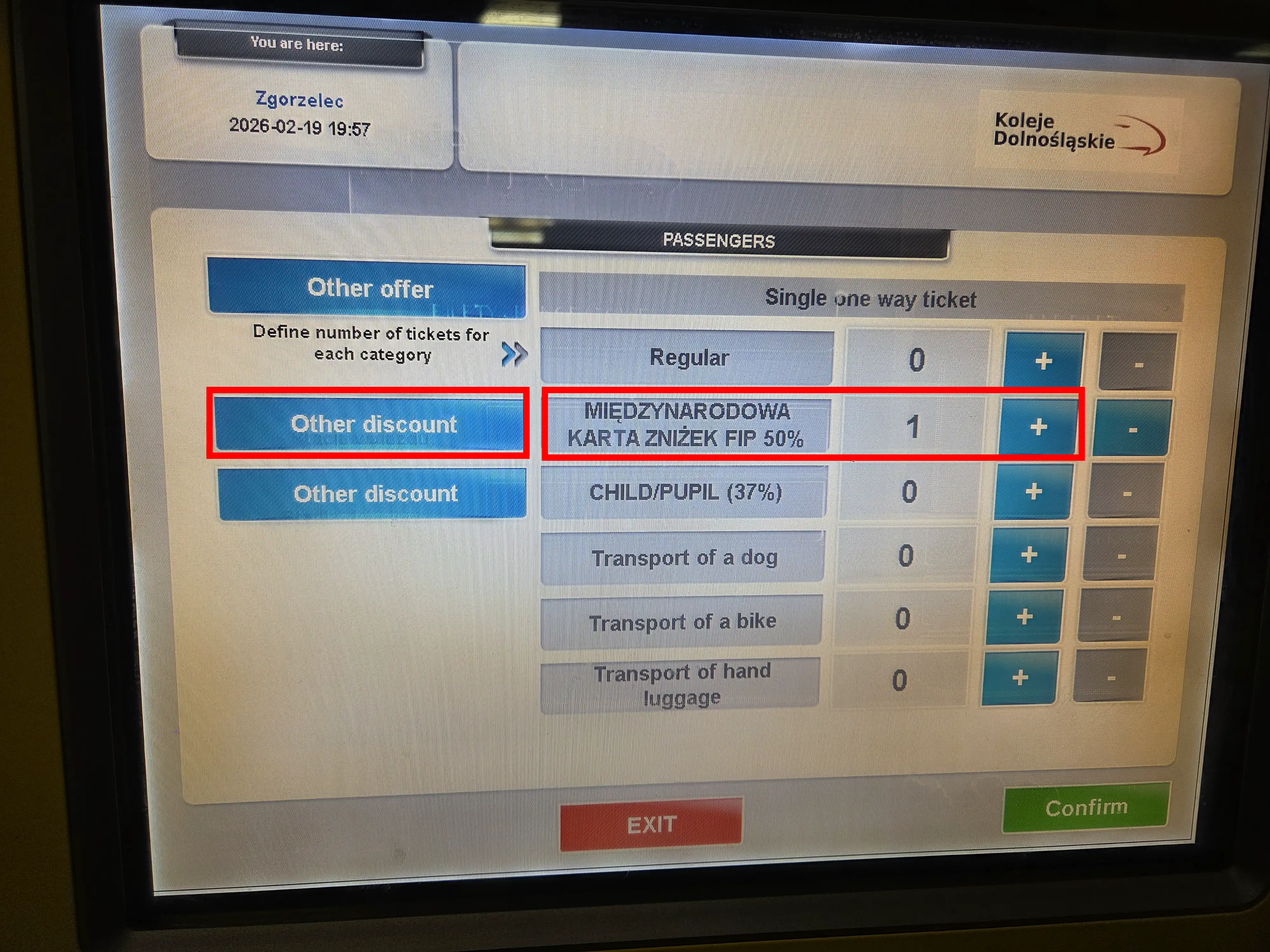 FIP 50 Tickets can also be purchased directly on the train. To do this, you must contact the train staff immediately after boarding. When boarding at stations that also have a ticket office or ticket machine, a surcharge for issuing the ticket on the train may be added to the ticket price. Tickets can be paid for in cash or by contactless credit card (Visa, Visa Electron, V Pay, Mastercard, Maestro). Payment is only possible in Polish zloty.1